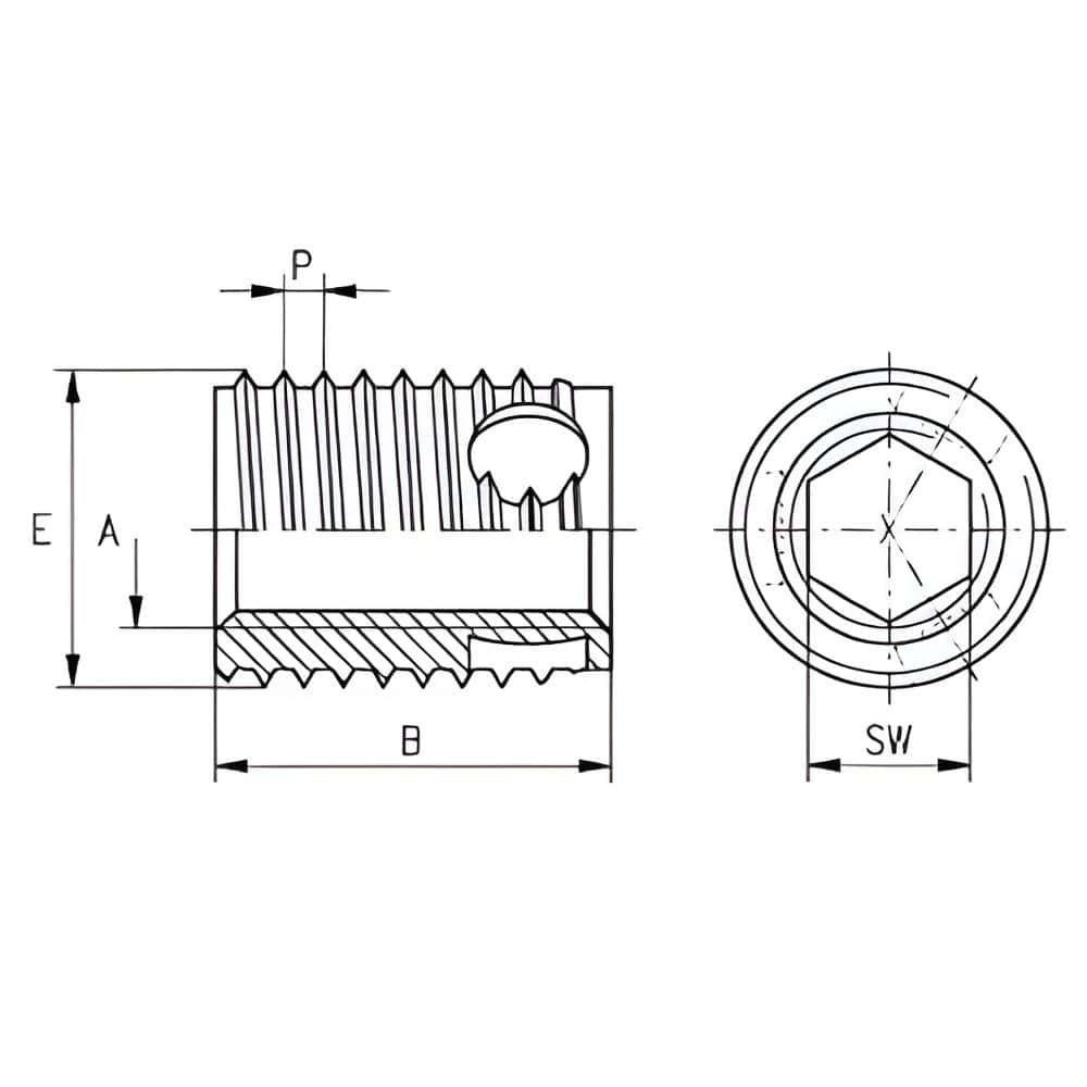 | Mã sản phẩm | Ren trong (A) | Ren ngoài (E) | Bước ren (P) | Chiều dài (B) | Lục giác chìm (SW +0,1) | ĐK lỗ khoan (L -0,1) | Sâu lỗ tịt tối thiểu (T) |