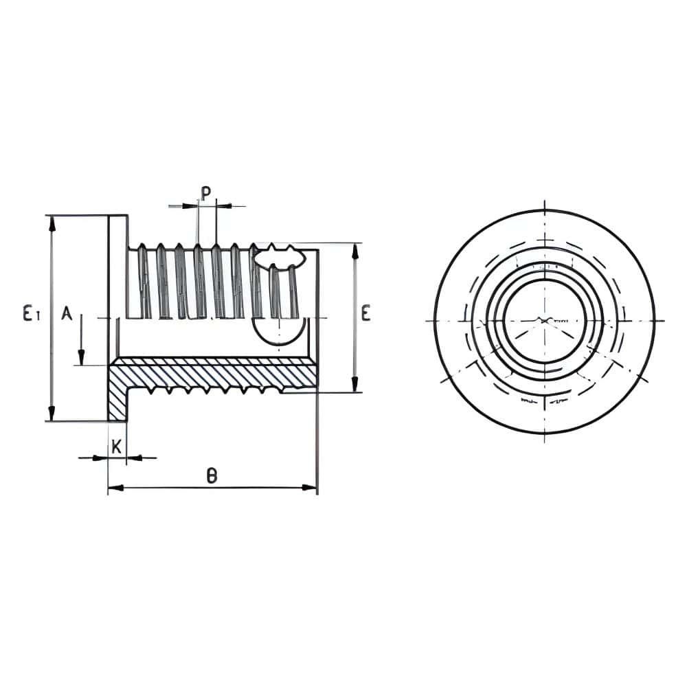 | Mã sản phẩm | Ren trong (A) | Ren ngoài (E) | Bước ren (P) | ĐK đầu (E1) | Cao đầu (K) | Chiều dài (B) | Lục giác (SW +0,1) | ĐK lỗ khoan (L) | Sâu lỗ tịt (T) |