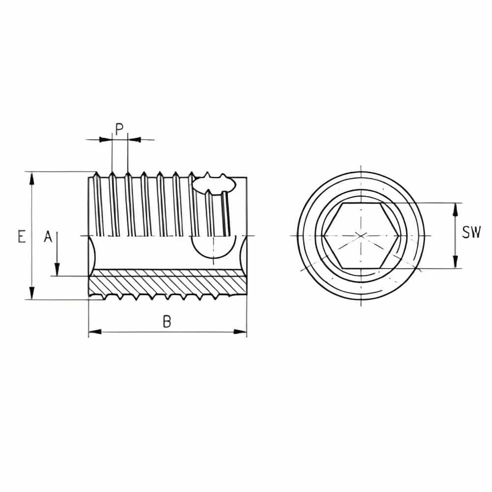 | Mã sản phẩm | Ren trong (A) | Ren ngoài (E) | Bước ren (P) | Chiều dài (B) | Lục giác chìm (SW +0,1) | ĐK lỗ khoan (L) | Chiều sâu lỗ tịt tối thiểu (T) |