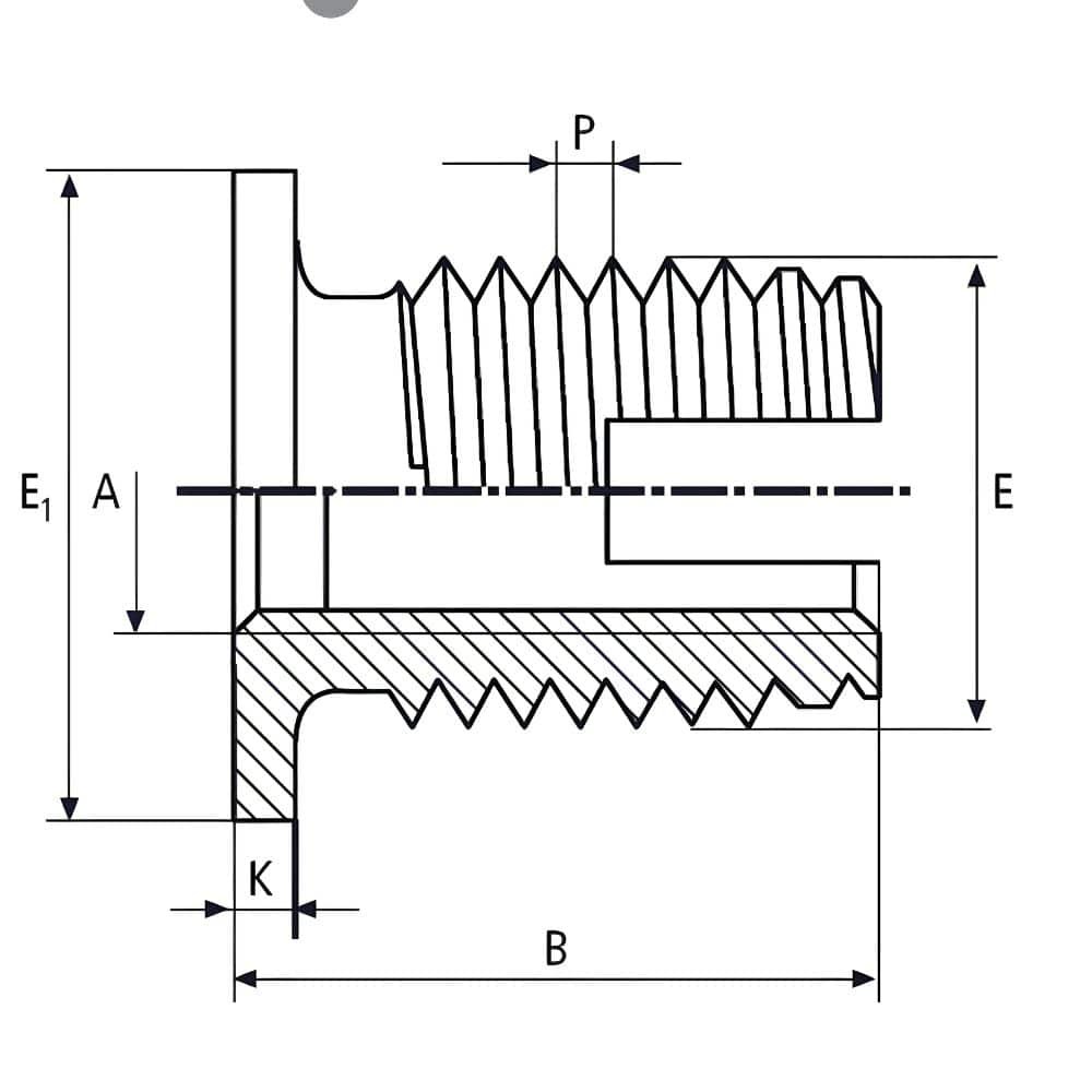 | Mã sản phẩm | Ren trong (A) | Ren ngoài (E) | Bước ren (P) | Đường kính đầu (E1) | Chiều cao đầu (K) | Chiều dài (B) | ĐK lỗ khoan (L) | Chiều sâu lỗ tịt tối thiểu (T) |